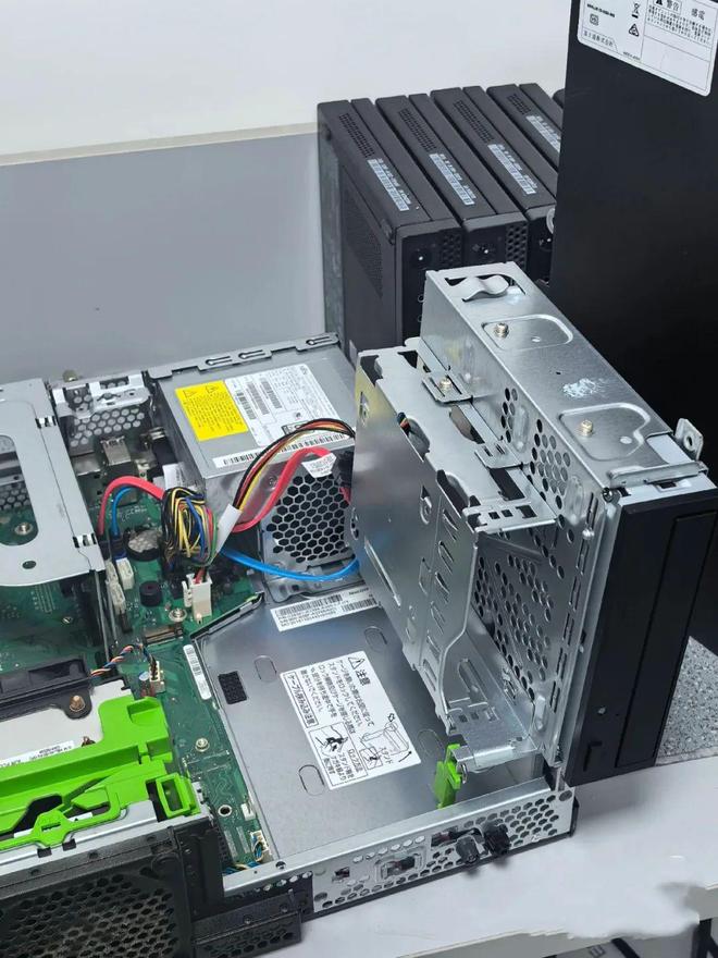 这款小主机想要拓展5盘位,需要把光驱位置拆掉,买一个5.25光驱位转3盘位硬盘支架,可以直接上2个2.5+1个3.5。在光驱下面的硬盘支架位置可以螺丝固定一个2.5+1个3.5.其实如果嫌弃2.5和3.5一起太拥挤,可以买PCIE插槽位置转2.5盘位,把2.5寸硬盘固定在PCIE插槽位置也可以,原机只有2个sata供电线,需要买两条一转多硬盘电源线即可。